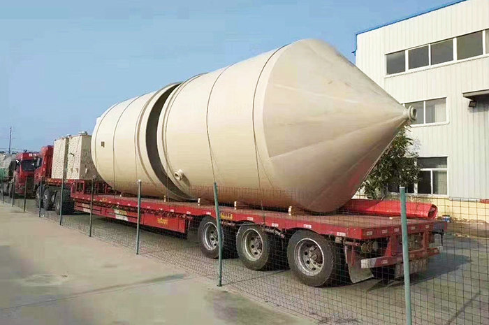 錐底儲罐采用意大利技術(shù)制作,內(nèi)襯層為噴射成型制作,內(nèi)襯層的富樹脂層樹脂含量達(dá)95%,內(nèi)襯層樹脂含量為80%。儲罐內(nèi)襯層采用錐形水泥模具制作,儲罐結(jié)構(gòu)層為整體纏繞制作而成。罐體底部為帶鋼套環(huán)支腿,大大提升儲罐穩(wěn)定性。攪拌型錐底立式儲罐,內(nèi)設(shè)擋流板,罐體頂部設(shè)置支撐架,儲罐輕質(zhì)、高強,耐腐蝕性強、使用壽命長。